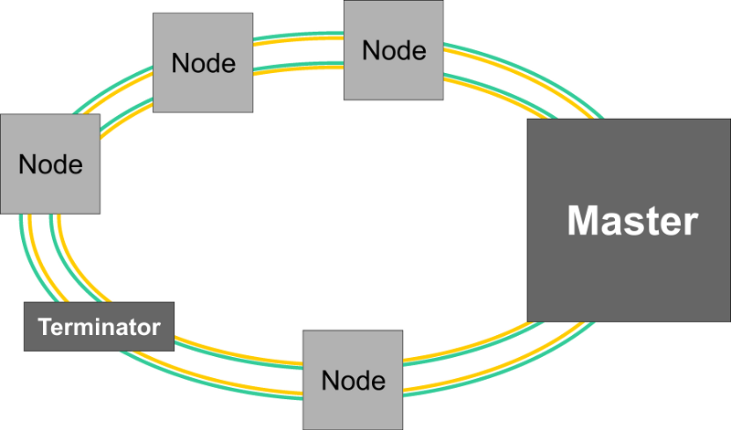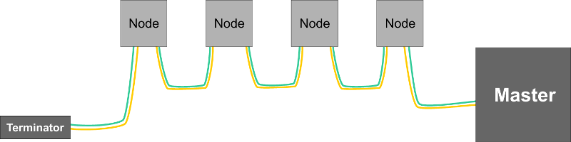 모든 노드가 각각의 선으로 연결이 되어 있고 노드 묶음의 양 끝에 Master와 Terminator가 존재한다. 이러한 형태의 네트워크는 topology의 선형 특성으로 공장 바닥에 설치하기 쉬워 조립 설비 공장 같은 산업용 애플리케이션에 있어 적합하다.