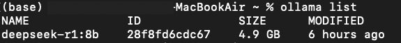 위 명령어를 통해 설치된 DeepSeek 모델 목록을 확인할 수 있습니다.